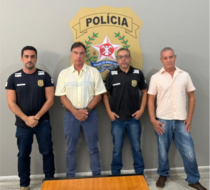 Três Pontas recebe na próxima terça-feira (25), às 10 horas, no Auditório da Cocatrel, a visita da Chefe de Polícia Civil de Minas Gerais, Dra. Letícia Gamboge, para tratar da instalação da Delegacia Rural em Três Pontas, com foco no trabalho de combate aos crimes no campo. Na oportunidade, a Delegada vai anunciar a implantação de um núcleo da Delegacia Especializada no município. Na edição deste sábado, o CT conversou com o investigador da Polícia de Três Pontas, vereador Rodrigo Silva (União Brasil), que vem trabalhando neste sentido há um bom tempo, e também com os representantes do Consep Travessia, Paulo Fasano e Márcio. “O objetivo da Delegacia Rural é fortalecer a segurança do agronegócio. Existe uma preocupação generalizada entre os produtores de café, do grande ao pequeno. A Delegacia Rural vai trazer um alento a todos os produtores”. Na foto, Dr. Gustavo Gomes (Delegado), Paulo Fasano (Consep), Rodrigo Silva (Polícia Civil) e Márcio (Consep).