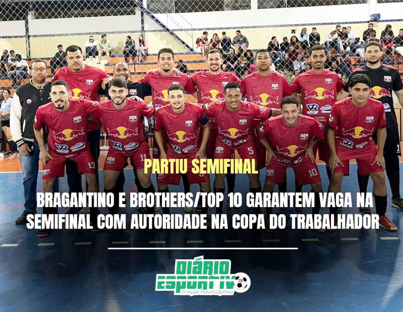 Duas equipes garantiram vagas nas semifinais da Copa Futsal do Trabalhador. Em rodada realizada nesta terça-feira (24), no Ginásio Poliesportivo Aureliano Chaves de Mendonça, a equipe Brothers/Top 10 venceu o Moacyr Supermercado por 4 x 1. Na outra partida, o Bragantino (foto) venceu o Santana Esporte Clube pelo mesmo placar: 4 x 1. Ambas equipes chegam com moral elevado para disputar uma vaga na grande final da compétição. Na noite desta quinta-feira (26), serão definidos os outros dois semifinailistas com os confrontos entre Concrelongo Futsal x Chapadão Lanches e Conveniência do Missinho/Calhas e Cia x Com Agro Fertilizantes.