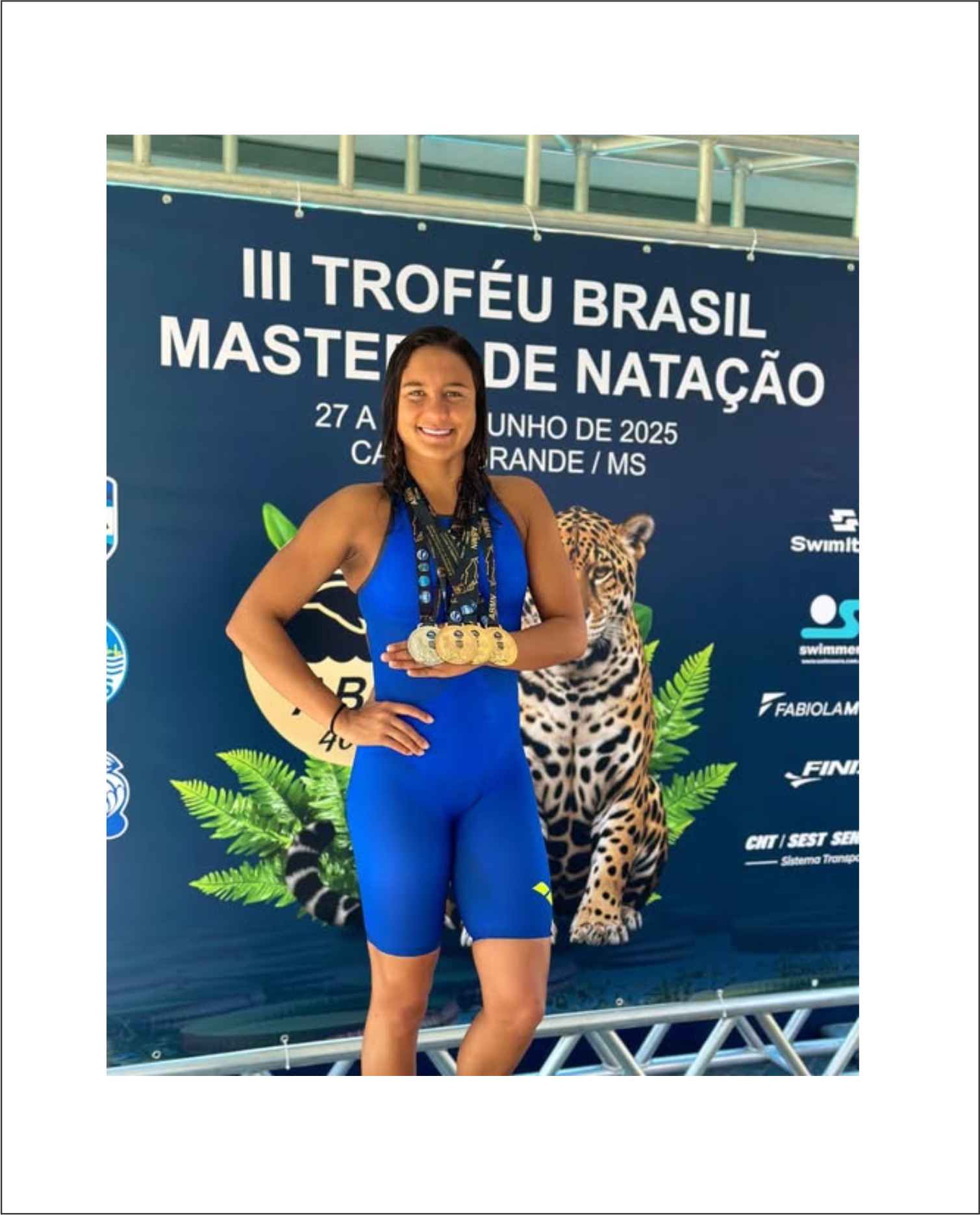 A nadadora trespontana Áddilla Caroline foi um dos grandes destaques do III Troféu Brasil Master de Natação, realizado entre os dias 27 e 29 de junho de 2025, no Rádio Clube, em Campo Grande (MS). Ao longo dos três dias de competição, ela participou de quatro provas individuais e conquistou resultados expressivos, somando três medalhas de ouro e uma de prata. Os pódios de Áddilla Caroline foram os seguintes: 1º lugar (50 metros livre); 1º lugar (100 metros livre); 1º lugar (100 metros costas) e 2º lugar (50 metros costas). “Estou muito feliz com meu desempenho, especialmente por ter nadado próximo das minhas melhores marcas, mesmo estando em uma fase mais intensa do treinamento”, declarou Áddilla. O foco da nadadora agora se volta para um desafio ainda maior: o Campeonato Mundial de Natação Master, que será disputado em Singapura, onde representa a delegação do Brasil no cenário internacional. (Fonte: Três Pontas Stúdio live).