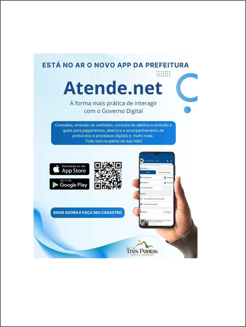 A Prefeitura Municipal de Três Pontas está disponibilizando o novo aplicativo Atende.Net, uma ferramenta moderna que aproxima o cidadão do Governo Municipal. O app oferece uma série de funcionalidades digitais para facilitar o acesso da população aos serviços públicos – tudo disponível 24 horas por dia, 7 dias por semana, diretamente no celular. Com o Atende.Net, o cidadão pode consultar débitos, emitir certidões, acessar guias de pagamento, abrir e acompanhar protocolos e processos digitais, além de enviar solicitações e acompanhar demandas de forma prática e transparente. Segundo a Administração Municipal, “o objetivo é modernizar a gestão pública e oferecer uma forma simples, rápida e eficiente de comunicação entre população e governo, reforçando o compromisso com a transparência, agilidade e inovação no atendimento”. O aplicativo está disponível para download gratuito nas plataformas Google Play e App Store. Os usuários deverão realizar o cadastro próprio no Atende.Net, através do app ou acessando o link: https://trespontas.atende.net/autoatendimento/servicos/solicitacao-de-acesso. Baixe o app agora e tenha a Prefeitura de Três Pontas na palma da sua mão! (Fonte: Ascom PMTP).