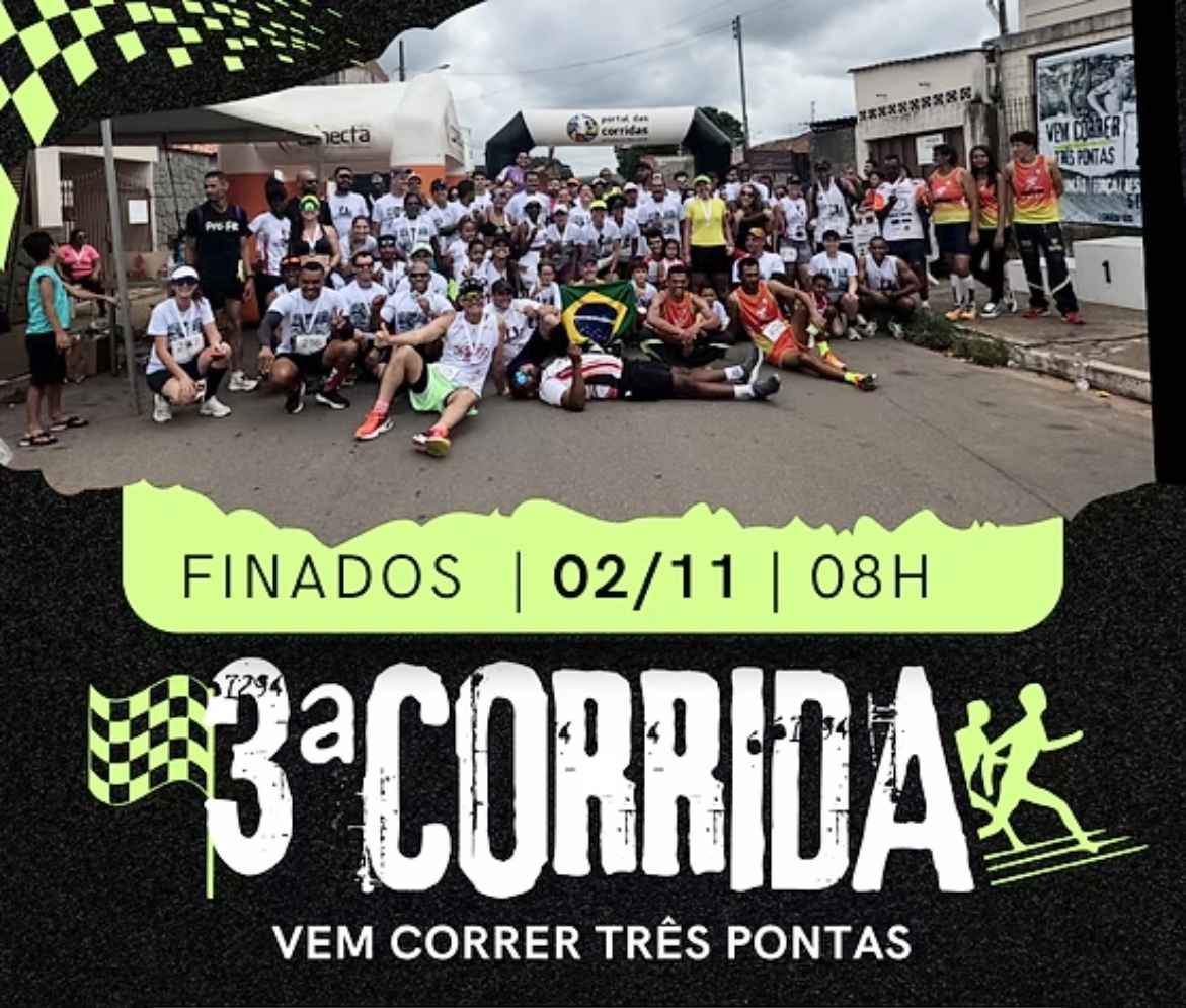 A tradicional Corrida “Vem Correr Três Pontas” chega a sua 3ª edição no próximo domingo, dia 2 de novembro, feriado de Finados. A largada será em frente à Oficina do João Peres, na Rua Vicente Celestino, às 8 horas da manhã. O evento promete reunir atletas e amantes do esporte de toda a região, em um clima de confraternização e superação. Os participantes poderão escolher dois percursos: 5 km, indo até o bairro Foguetinho e retornando ao ponto de partida; e 10 km, seguindo até o trevo próximo ao Motel Paraíso e voltando. As inscrições podem ser feitas no Portal das Corridas. O evento é uma ótima oportunidade para quem busca um desafio esportivo, manter a saúde em dia e aproveitar o feriado de forma ativa e divertida. A organização promete uma estrutura completa, com suporte aos corredores e toda a energia positiva que já se tornou marca registrada da prova.