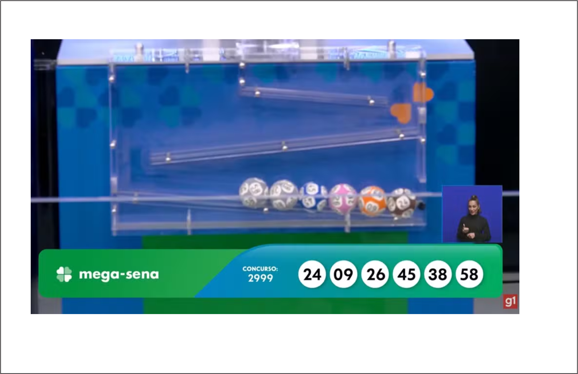 O sorteio do concurso 2.999 da Mega-Sena foi realizado na noite desta quinta-feira (23), em São Paulo. Nenhuma aposta acertou as seis dezenas, e o prêmio para o próximo sorteio acumulou em R$ 100 milhões. Os números sorteados foram: 09 – 24 – 26 – 38 – 45 – 58. Com 5 acertos – 111 apostas ganhadoras: R$ 28.755,27; com 4 acertos – 5.741 apostas ganhadoras: R$ 916,43. O próximo sorteio da Mega será no sábado (25). A aposta mínima para a Mega-Sena custa R$ 6. Para um jogo simples, a probabilidade de ganhar o prêmio milionário é de 1 em 50.063.860, segundo a Caixa. Já para uma aposta com 20 dezenas (limite máximo), com o preço de R$ 232.560,00, a probabilidade de acertar o prêmio é de 1 em 1.292, ainda de acordo com a instituição. (Fonte: G1 / Foto: Reprodução Caixa).